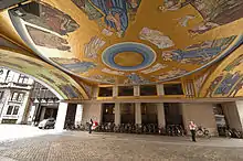 Den udendørs mosaikudsmykning i hvælvet under Den ny Scene, Stærekassen, fra (1932-38) indeholder motiver af berømte danske mænd og folk, der arbejder, mens de lytter til radioen, bygningen husede oprindelig Statsradiofonien. Udsmykningen forårsagede efter indvielsen en heftig polemik i pressen.