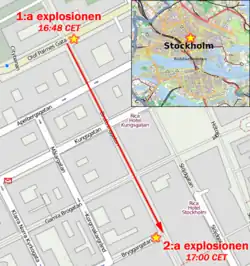 Den første eksplosion indtraf på hjørnet af Olof Palmes Gata og Drottninggatan ikke langt fra hvor den svenske statsminister Olof Palme blev myrdet. En bil af mærket Audi 80 Avant var parkeret ved Olof Palmes gata 13 og eksploderede omkring klokken 16:50. Bilen indeholdt flere gasflasker. Den store eksplosion blev efterfulgt i minutterne efter af flere mindre brag.[2]