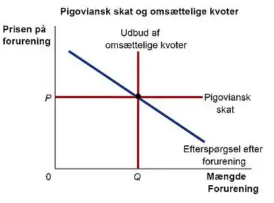 I visse tilfælde er der ikke forskel på at indføre en pigoviansk skat og udbyde omsættelige kvoter. De to adskiller sig dog ved, at man ved en pigoviansk skat fastsætter en pris og derudfra kommer en mængde, mens man med omsættelige kvoter fastsætter en mængde og der herudfra kommer en pris.