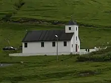 Kirken ligger ved Stórá-elven, som deler bygden i to dele med hver sit lille landingssted.