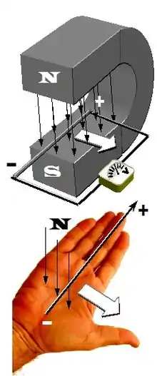 Ledningsstykket-i-magnetfeltet vil så blive udsat for en kraft (Laplaces lov), som vil presse ledningsstykket-i-magnetfeltet i lillefingerens retning.