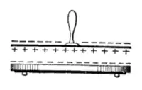 - Den dielektriske plade lades statisk via den triboelektriske effekt ved at gnubbe den mod pels eller tøj. (I denne beskrivelse antages det, at den dielektriske plade bliver negativt ladet ved gnubning.)
