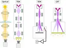 Elektroner er omfattet af den partikel-bølge dualitet, som den franske fysiker Louis de Broglie introducerede i 1924: Hvor lys kan afbøjes og fokuseres med optiske linser, kan en elektronstråle tilsvarende afbøjes og fokuseres ved hjælp af elektriske og magnetiske felter.