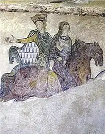 ![]() Samtidigt billede af Eleonora. Ledsageren menes at være enten hendes yngste søn, Johan, eller datteren, Johanne, eller svigerdatteren, Berengaria | |