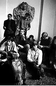 ![]() Crouching bag på væggen, Elias Maria Reti, blandt eleverne fra Joseph Beuys, 1969. | |