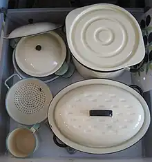 Ordet emalje kan også bruges om metalgenstande som er udsmykket med emaljedekoration og -belægning. En person som arbeider i emalje, kan kaldes for emaljør.