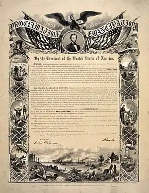 Lincoln diskuterede første gang proklamationen med sit kabinet i juli 1862. Han mente, at han havde behov for en sejr til Unionen på slagmarken, så hans beslutning ville virke positiv og stærk. Slaget ved Antietam, hvor Unionens tropper stoppede Sydstaternes invasion af Maryland gav ham muligheden for at udstede en foreløbig proklamation den 22. september 1862. Den endelige proklamation blev udstedt i januar 1863, 100 dage senere. Selv om han indirekte havde fået autoriteten af Kongressen, valgte Lincoln at bruge sine beføjelser som øverstkommanderende for hær og flåde til "at vælge nødvendige skridt i krig" som grundlag for proklamationen frem for en lov vedtaget af kongressen eller en tilføjelse til forfatningen.