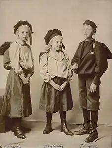 ![]() Billedhuggeren Emma Matthiasen (v) som barn, fotograferet omkring år 1900 sammen med sine søskende, Dagmar (m) og Thyge (h). Fotograf: Christoffer Gade Rude. Billedet er i Oslo Museums Byhistoriske samling. | |