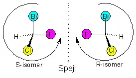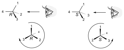 Betegnelserne R (fra latin rectus, højre) og S (fra latin sinister, venstre) benyttes til at skelne mellem to enantiomerers konfigurationer. Ved bestemmelse af konfigurationen for en enantiomer tages udgangspunkt i et kiralt center. De fire grupper der er bundet til det kirale center nummereres efter prioritet. Desto højere atomvægt, desto højere prioritet. Hvis der er to kulstofatomer bundet til det kirale center, ser man på hvilke grundstoffer der er bundet til de to kulstofatomer.
