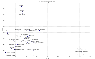 For brændstoffer er energi per enhed rumfang nogle gange en brugbar parameter. Til eksemplificering på at energi per enhed rumfang kan være bedre haves følgende eksempel; brændstoffet hydrogen i forhold til benzin – hydrogen har en højere specifik energi end benzin, men hydrogen har selv i flydende form, en meget lavere energitæthed.