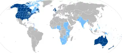 | Talt i: | Hovedsprog: • Storbritannien • USA • Sydafrika • Kenya • Canada • Australien • Sydafrika • Irland • New Zealand • Singapore • Jamaica • Bahamas andre som sekundært officielt sprog  | |