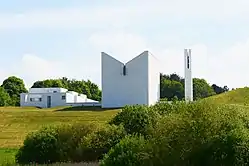 Stilistisk tilhører kirken modernismen og minimalismen. Den er udført i hvide betonelementer og har som et særligt karkateristika et nedadvendt tag. På afstand minder den således om en tøjklemme. Idet bygningen er placeret på toppen af en bakke, fremstår den markant i landskabet og kan bl.a. ses fra den nærliggende Nordjyske Motorvej. Ved siden af kirken er en høj, hvor der står et kors. Sognegården med konfirmandlokaler og kirkehus er udført som et kompleks af mindre bygninger med atriumgårde, og er bygget sammen med kirken.