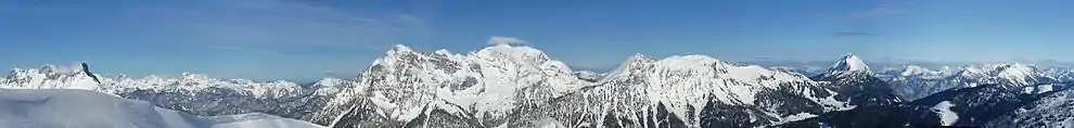 ![]() Hochtor - Ödstein Gruppen (Gesäuse) (fra højre mod venstre) set fra Hoher Zinken i syd | |