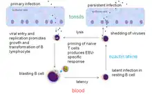 Bindingen af viruspartikler til B-lymphocytter sker ved hjælp af fem glycoproteiner på overfladen af viruspartiklen: gp350/220, gp42, gB og gH/gL, der i samspil binder sig til B-lymfocyttens overfladeproteiner: CD21 og MHC (major histocompatibility complex) klasse II og derved udløser kaskader af signaltransduktion, der gør cellen stabil overfor en latent infektion. Dette indebærer bl.a. blokering af apoptosen og ændringer i histonprofilen.