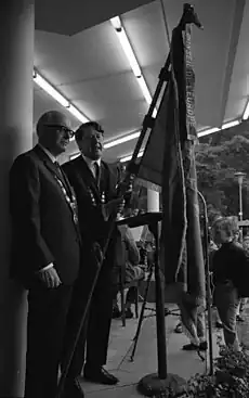 ![]() Erhard Jakobsen (nr. 2 fra venstre) med en Europafane i Bonn, 1969  | |