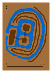 Der findes ingen synlige bygningsrester. Ved udgravningen i 1977 fandt man kun to spor af bygningsværker: Under den dobbeltkronede vold rester af et hus brændt kort før opførelsen af borgen. Og på den nordlige inderborg efterladenskaber fra en smedje, som har været i brug i borgens ungdom. Måske har der været flere bygninger af træ, som ikke har kunnet konstateres ved udgravningerne.
