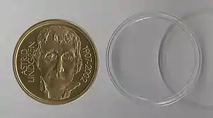 En erindringsmønt (og etui) med Astrid Lindgren udsendt i 2002; værdien er 50 SEK. På bagsiden Pippi Langstrømpe og hendes abe, herr Nilsson.
