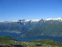 Fotografi taget fra fjeldet på østsiden af Fjærlandsfjorden. Esefjorden går ind mellem næsset med Dragsvik og kommunecentret Balestrand.