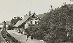 Den første stationsbygning blev opført til åbningen i 1880 efter tegninger af Balthazar Lange. Den blev revet ned i 1966, efter at en pavillon var blevet opført i 1964 efter tegninger af Helge Seiersted ved NSB Arkitektkontor. Desuden er der en banevogterbolig af type Z tegnet af Peter Andreas Blix ved stationen.