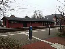 Den røde træbygning, der stadig ligger på banens østside, er den oprindelige stationsbygning (senere postekspedition).