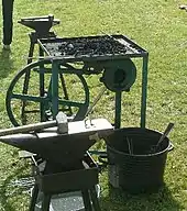 Essen er formet så der er plads til brændslet, ofte koks, og en underliggende bælg og en dertil hørende luftpumpe. Denne var tidligere manuelt drevet, men er i dag oftest en elektrisk drevet centrifugalblæser.