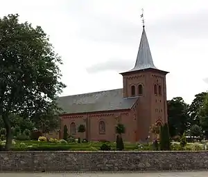Kirken er bygget i rundbuestil af røde munkesten,[32] på en sokkel af granitkvadre fra Gammel Essenbæk Kirke. Den består af et skib og kor i ét, indvendigt adskilt af en rundbuet triumfmur, samt en apsis mod øst,[25] og mod vest et 26,4 meter højt tårn, inkl. et ottekantet spir, hvis underrum benyttes som våbenhus. Kirkens bjælkeloft er dækket med bly.[26]