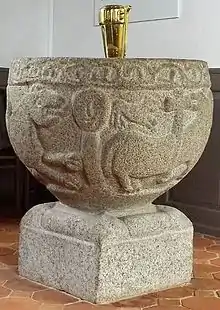 Døbefonten fra den tidlige middelalder[32] er af granit i romansk stil,[26] med relieffer af hoveder på stage,[25] et korslam, en fugl og to løver på kummen.[26] Den benyttedes som fuglebad[11] i haven ved Gammel Estrup, til den i 1869 flyttedes til kirken.[26] Den er nok identisk med døbefonten der i 1830 stod i Gammel Essenbæk Kirke.[22]