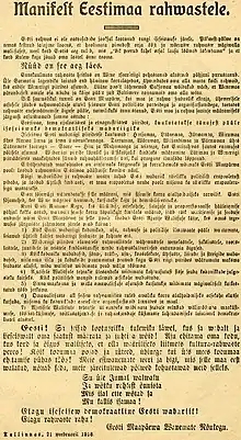 I denne time har Estlands Landdag, som den lovlige repræsentant for vort land og folk, i fuldstændig enighed med de estiske demokratiske politiske partier og organisationer og med den ret der tilkommer folkene til selvbestemmelse, fundet det nødvendigt at tage de følgende afgørende skridt for at forme det estiske lands og folks skæbne.