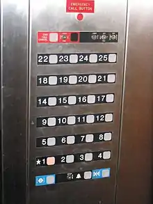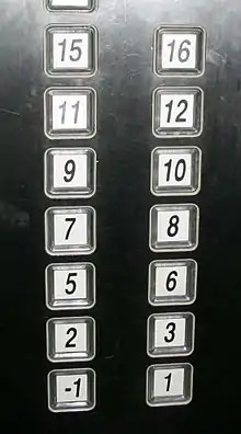 Elevatorer er inddelt i S for stueetage og 1, 2, 3 osv. for ovenliggende etager samt eventuelt -1, -2, -3 osv. for underliggende etager.