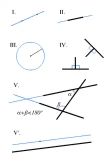 • Hvis et linjestykke skærer to rette linjer, så de danner to indre vinkler på hver side, som tilsammen er mindre end to rette vinkler, så vil de to linjer, hvis de forlænges uendeligt, mødes på den side, hvor de to vinkler er mindre end to rette vinkler.