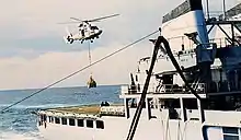 En Panther helikopter fra det franske skib Cassard (D614), der overfører gods til Meuse