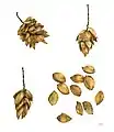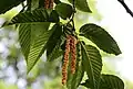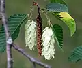 ![]() Her ses både de karakteristiske, humleagtige frøstande og de dobbelt savtakkede bladrande hos Europæisk Humlebøg. | |