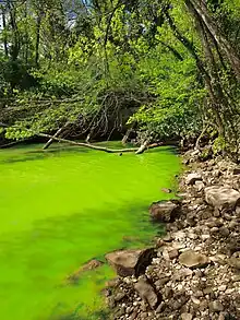 Eutrofiering i Potomacfloden, der ses ved det grønne vand, der skyldes opblomstring af cyanobacteria.