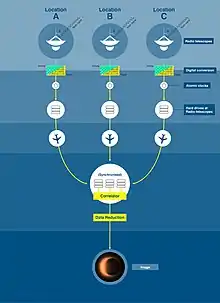 Den 10. april 2019 blev det annonceret på en pressekonference i Bruxelles af Event Horizon Telescope-samabejdet, at man for første gang i historien havde taget et billede af et sort hul. Det supermassive sorte hul i centrum af M87, der benævnes M87*,[4][7] er optaget ved hjælp af radio-interferometri. Man har selvfølgelig ikke lavet et billede af det sorte hul, men man har lavet billeder i falske farver fra otte radioteleskopers modtagne radiobølger med en bølgelængde på 1,3 mm (EHF; millimeterbølger) udenfor, men tæt på, det supermassive sorte huls begivenhedshorisont i centrum af galaksen M87. Via Event Horizon Telescope samarbejdet har man estimeret M87* til at have en masse på (6,5 ± 0,2stat ± 0,7sys ) × 109 solmasser.[8] Det er en af de højeste kendte masser for sådan et objekt.
