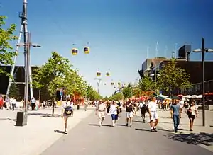 Svævebanen var en af de store attraktioner ved verdensudstillingen. De karakteristiske gule gondoler var synlige stort set hvor som helst på det store messeområde. En tur med Expo-Seilbahn gav publikum mulighed for et unikt overblik over udstillingen når de kørte tværs over området i 30 meters højde.