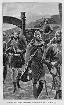 - Arnkel havde lænet sit sværd og skjold op ad høstakken. Han greb da sine Vvben og værgede for sig, men var nu mere udsat for at blive såret. Fjenderne trængte nu ind i gærdet, men Arnkel sprang op paa høstakken og værgede sig der en stund, men blev til sidst overmandet og dræbt. De dækkede liget til med hø der i gærdet. Derpå drog Snorre hjem til Helgefjæld.[17]