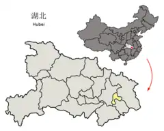- Bydistriktet Liangzihu (梁子湖区), 525 km², 180.000 indbyggere;