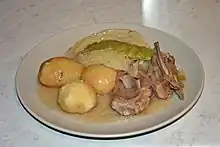 Fårikål serveret med kogte kartofler.