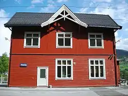 Stationsbygningen, der er en toetages bygning i rødmalet træ, blev opført til åbningen i 1896 efter tegninger af Paul Due.