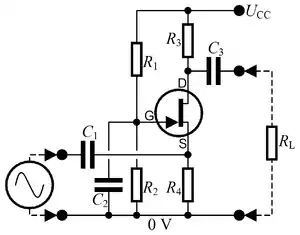 Gatens spænding tilpasses så den er en kende lavere end spændingen på transistorens source; derved tillades en vis strøm, kaldet hovedstrømmen, gennem drain- og source-forbindelserne. Denne strøm medfører et vist spændingsfald over drainmodstanden og sourcemodstanden . Hele arrangementet er selv-stabiliserende, sådan at evt. variationer i hovedstrømmen vil få spændingsforskellen mellem gate og source til at ændres i en retning der bringer strøm og spændinger i trinnet tilbage til det tilsigtede arbejdspunkt.