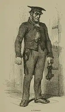 Tegning af fængselsbetjent med nøglerne til cellerne (1897).