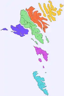 | 4. Suðuroyar sýsla | Suderø syssel | Tvøroyri | 5 000 | 167 | 29,94 | FO-SU |