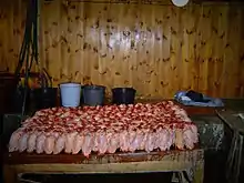 Slagtede får bliver ophængt i ét stykke. Slagtede fugle og fisk bliver ophængt parvis på en tørrestang. Grind skæres i aflange kødlunser (som kaldes likkjur i flertal, likkja i ental, grindalikkja) og bindes rundt om en tørrestang ofte udendørs under et tagudhæng.