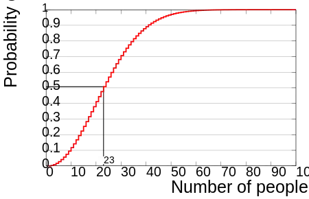 Grafisk fremstilling af sandsynligheden for at mindst to personer har samme fødselsdato, som funktion af antal personer i gruppen.