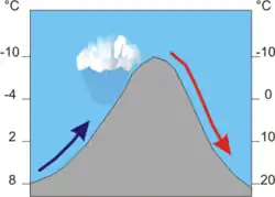 Normalt ændres temperaturen for fugtig luft 0,5° C pr 100 meter, mens den tilsvarende temperaturændring for tør luft er 1,0° C. Dermed bliver luften på læsiden varmere end på nedbørssiden. Føneffekten er kraftigere jo højere bjerget er. Når der opstår fønvind, kan temperaturen stige betragteligt indenfor få timer.