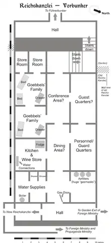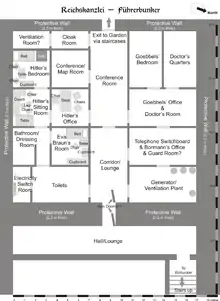 Anlægget var stort, med soverum, opholds- og spiserum og kontorer for dele af partieliten og andre nøglepersoner. Det øvre af de to niveauer lå omkring 8,2 meter under jorden, og under dette var et niveau, hvor Hitlers personlige område befandt sig. Dette bestod af 17 små rum, og ud over Hitler opholdt blandt andre Eva Braun, Joseph Goebbels med familie og Ludwig Stumpfegger sig dér.