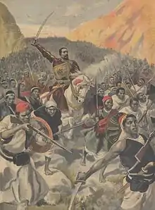 ![]() I urets retning fra top venstre: Italienske soldater på vej til Massawa; Yohannes 4.'s slot ved Mek'ele;[2] Etiopisk kavaleri ved Slaget om Adwa; Italienske fanger befries efter krigshandlingernes afslutning; Menelik 2. ved Adwa; Ras Makonnen anfører etiopiske tropper i Slaget ved Amba Alagi |