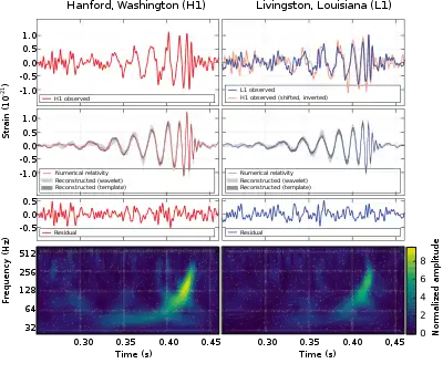 Den første observation af gravitationsbølger blev gjort den 14. september 2015.[1][2][3][4] Signalet er blevet navngivet GW150914.[1][5] Den detekterede bølgeform matcher den generelle relativitetsteoris forudsigelser for et binært system af sorte huller, der spirallerer mod hinanden og efterfølgende kolliderer og smelter sammen.[6] Observationerne viste således eksistensen af sådanne par af sorte huller, der kredser om hinanden, samt deres kollision. Gravitationsbølger viser sig som små forstyrrelser af rumtiden, og blev målt inden for et kort tidsinterval af to forskellige detektorer placeret med 3000 kilometers afstand, begge i USA.