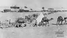Transport blev organiseret i en kombination af heste- og muldyrtrukne forsyningskolonner og kamelkaravaner for at forsyne den Østlige styrkes operationer hinsides jernbanens endepunkt i omkring 24 timer.[66][Note 4] "Vognene [i den beredne Anzac division] med deres muldyrspand, to foran og tre bagved, [blev] drevet af en mand fra kassen." Disse vogne og muldyr var så vellykkede, at spandet med 5 muldyr blev "anvendt af den egyptiske ekspeditionsstyrke ... og til sidst næsten afløste de britiske fire og seks-spand med forridere."[67]