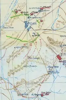 Udover disse naturlige forsvarsværker byggede den osmanniske hær skyttegrave og skanser, som strakte sig fra sydvest for byen næsten hele vejen rundt om den, bortset fra et hul mod nordøst. Undervejs inddrog de Ali Muntar i byens forskansninger ved at bygge yderligere stillinger på højderyggen syd for byen.[39] Selv om skyttegravene kun var let forstærkede med pigtråd, lå de der var syd for byen med overblik over bare skråninger, som var fuldstændig uden dækning.[40]